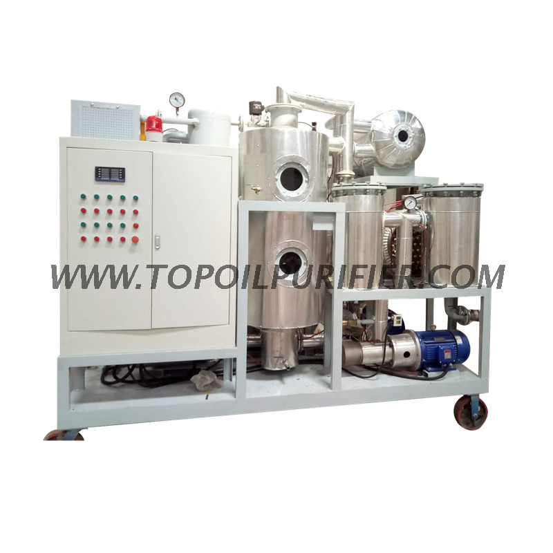 When the equipment works, the oil is transported through the primary filter by the oil inlet pump to remove large particles and impurities and can protect the oil inlet pump, then the oil runs into the preheater for heating, so as to improve the liquidity of the oil, which is good for the next processing; after heating, the oil runs through the secondary filter by the effect of pressure to remove small particles in the oil, and then the oil enters the vacuum vessel where adopts the molecular separation technology and with certain vacuum and temperature condition, forming a large area of multi-level vacuum evaporation space. This space can provide the oil a a retention process with a large aeration area and aeration time, and ensure a effective separation of oil and gases or water vapors. The mixture of evaporated water vapor and gases is condensed into liquid through the cooler, and the gas is pumped out by the vacuum pump.In this way, it completes the dehydration and degassing treatment. The high temperature water vapor and other gases evaporated from the vacuum vessel are cooled for two times by the condensing cooler. Most of the gas is reduced to water and stored in the water receiver. After being repeatedly cooled and dehumidification, the uncondensed gas is discharged from the exhaust port of the vacuum pump. The dehydrated oil is exported out through the oil outlet pump, and runs through the fine fitler to remove the fine impurities and finish the fitleration process of dehydration and degassing. The pre-treated oil is returned to the oil storage tank, and then transported to the regeneration device by the oil pump. After a period of adsorption and neutralization treatment, it is sucked and stored in the tank by the vacuum vessel and transported to the fine filter through the oil pump and discharged from the oil outlet.Then we get the clean oil.